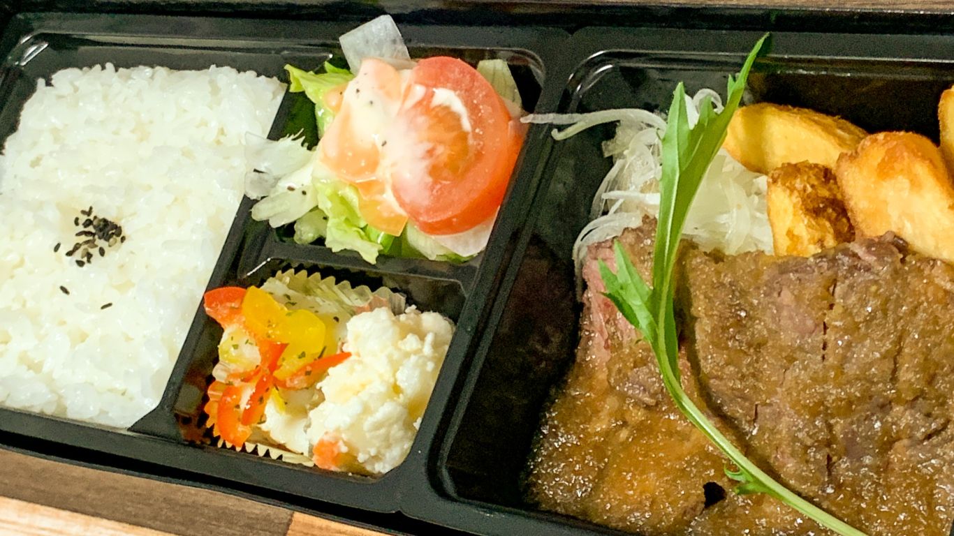 お店の名前を冠したお弁当です。Sorariの名前を付けるメニューだけあって、お店の自慢の一品であるステーキをメインにしています。